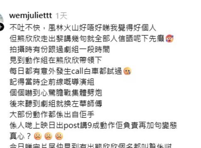 而《风林火山》的片尾工作人员名单里,熊欣欣是“客席动作指导”,据说因为这样熊欣欣就不满,他觉得大部分动作都是自己指导的,之后他再发文“就算我们按合约精神完成了百分之九十的动作,也不值得期待。” 但就有自称是剧组工作人员的人发文反击熊欣欣这个说法,表示熊欣欣的动作设计太狠辣,在他带领下有一段时间每天都有意外发生,甚至试过叫救护车,负责前线的导演都被吓到心惊胆战,甚至全部人员集体辞职。最后才由另一位动作指导邓瑞华接手,把大部分动作完成。 所以这位工作人员就表示,熊欣欣拿个“客席动作指导”差不多了,他说的百分之九十的动作,并不太可信。
